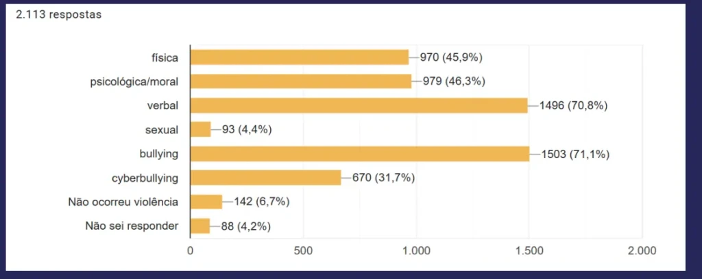 Os dados foram sistematizados por um painel técnico de estatística vinculado ao projeto e revelam um cenário que preocupa: mais de 50% dos professores respondentes identificaram aumento na violência entre alunos no ambiente escolar. Entre as tipologias relatadas, o bullying aparece como a prática predominante, citado por 71% dos docentes como a forma mais recorrente de violência nas escolas.