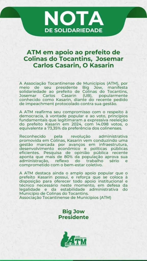 Por fim, a entidade destaca o “amplo apoio popular que o prefeito Kasarin possui” e informa que se coloca “à disposição para oferecer todo apoio institucional e técnico necessário neste momento, em defesa da legalidade e da estabilidade administrativa do Município de Colinas do Tocantins”.