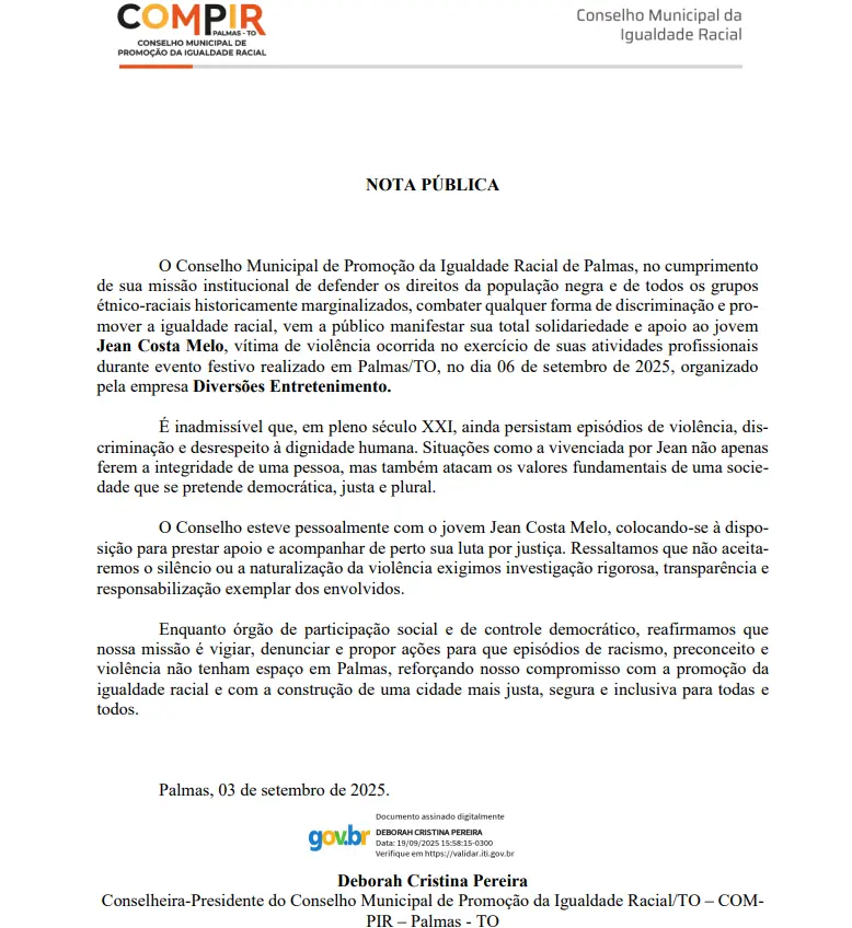 A Secretaria de Estado da Igualdade Racial do Tocantins (SEIR/TO) manifestou solidariedade à vítima e pediu rigor na apuração. A pasta destacou que, em um estado cuja população é composta em mais de 75% por pessoas negras, atos de racismo não podem ser tolerados. Em nota, convocou a sociedade tocantinense a romper com a normalização da violência e a se engajar na construção de uma narrativa em que todas as vidas sejam reconhecidas e respeitadas.