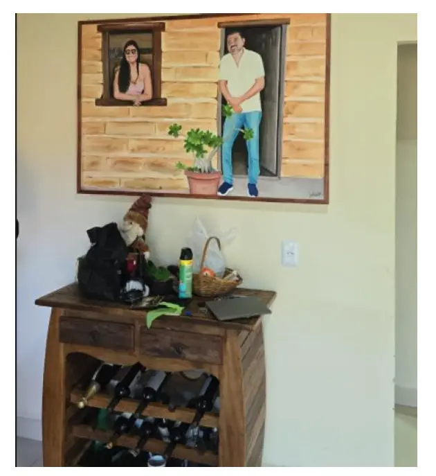 Segundo o relatório, a equipe policial esteve no local em setembro, durante cumprimento de mandado na segunda fase da Operação Fames-19. O documento relata que o caseiro, Adeilson Neres de Farias, afirmou trabalhar para “Mauro”, mas apresentou “inconsistências significativas” ao descrever a relação com o verdadeiro proprietário. No interior da casa, os agentes encontraram fotografias pessoais, roupas e um quadro de grande porte com a imagem de Wanderlei e Karynne, exposto na sala principal — elementos que, segundo a PF, comprovam o uso direto da residência pelo casal.