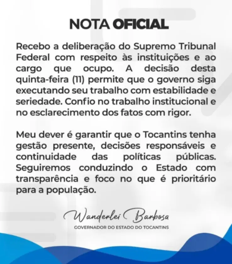 O governador do Tocantins, Wanderlei Barbosa (Republicanos), divulgou na noite desta quinta-feira, 11, uma nota oficial em que comenta a decisão do Supremo Tribunal Federal (STF) que manteve sua permanência no comando do Executivo estadual. O texto, publicado nas redes sociais do governo e de aliados próximos, marca a primeira manifestação oficial do governador após o julgamento da 2ª Turma da Corte, que confirmou por unanimidade a liminar que suspendeu seu afastamento.