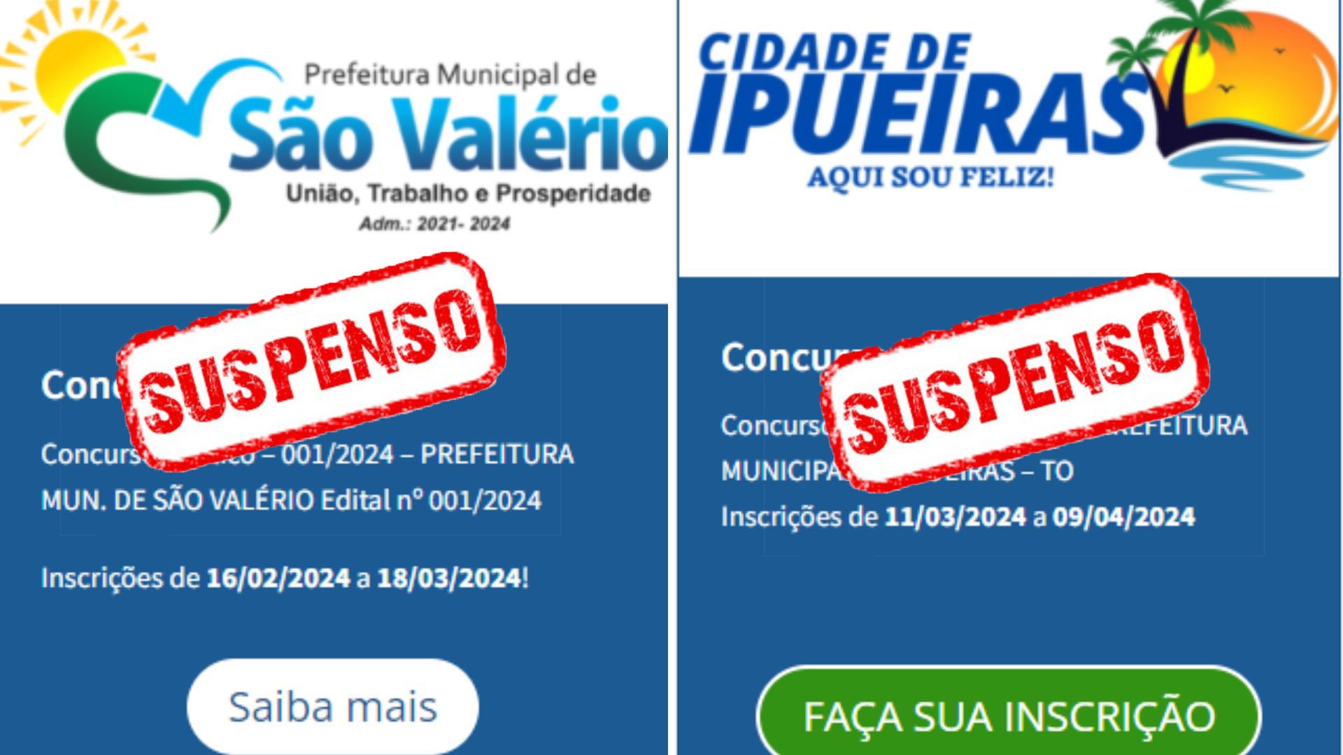 O concurso de São Valério do Tocantins estava com provas marcadas para este sábado, 13 e domingo, 14 e dispunha de 164 vagas e salários de até R$6 mil. Já o concurso de Ipueiras estava com data marcada para o dia 11 de maio, dispunha de 116 vagas e salários de até R$12 mil.