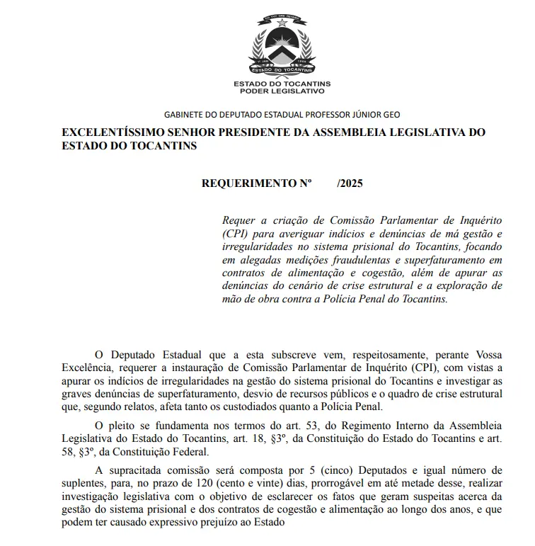 A Assembleia Legislativa do Tocantins recebeu nesta terça-feira, 21, um requerimento do deputado estadual Professor Júnior Geo (PSDB) solicitando a criação de uma Comissão Parlamentar de Inquérito (CPI) para apurar denúncias de má gestão e irregularidades no sistema prisional do Estado. O pedido foi protocolado com base em denúncias apresentadas pelo Sindicato dos Policiais Penais do Tocantins (Sindippen-TO). Para que a CPI tenha andamento, é necessário que oito parlamentares assinem o requerimento de Geo, incluindo ele.