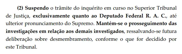 A liminar determina ainda a remessa dos autos e do material apreendido relacionados a Ayres ao STF, para que a Corte avalie a competência e decida sobre eventual desmembramento do inquérito. Enquanto isso, todas as diligências e apurações envolvendo Barbosa e demais investigados continuam sendo conduzidas normalmente pelo STJ, garantindo a continuidade da investigação sobre supostas irregularidades na gestão de recursos públicos da Fames.