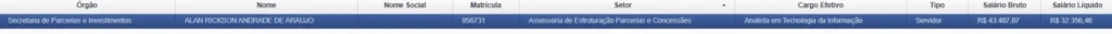 Álan Rickson, que exercia o cargo de Assessor de Estruturação de Parcerias e Concessões na Secretaria de Parcerias e Investimentos (SPI), recebia R$ 43.487,07, segundo o Portal da Transparência. O relatório da PF o descreve como colaborador direto de Thomas Jefferson Gonçalves Teixeira, ex-secretário da SPI e apontado como um dos principais articuladores do grupo político ligado ao governador afastado Wanderlei Barbosa.