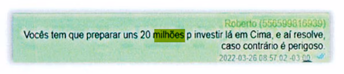 Mensagens também mostram repasses relacionados à empresa Fource Participações, do empresário Haroldo Augusto Dias, que seria representado por Zampieri em causas de recuperação de crédito. A PF encontrou 43 transações entre contas ligadas ao grupo Fource e o espólio de Zampieri, somando R$ 14,5 milhões.