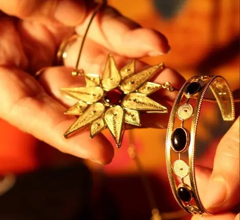 Entre as peças mais comuns estão crucifixos, colares, pulseiras, gargantilhas e anéis, usados tanto no dia a dia quanto em celebrações religiosas e festas populares. A técnica mais emblemática é a filigrana, um entrelaçado minucioso de fios finos de ouro, muitas vezes com a espessura de um fio de cabelo. Essa forma de trabalho tem origem na região do Minho, em Portugal, e foi trazida ao Brasil durante o período colonial, adaptando-se ao território tocantinense com o passar dos séculos.