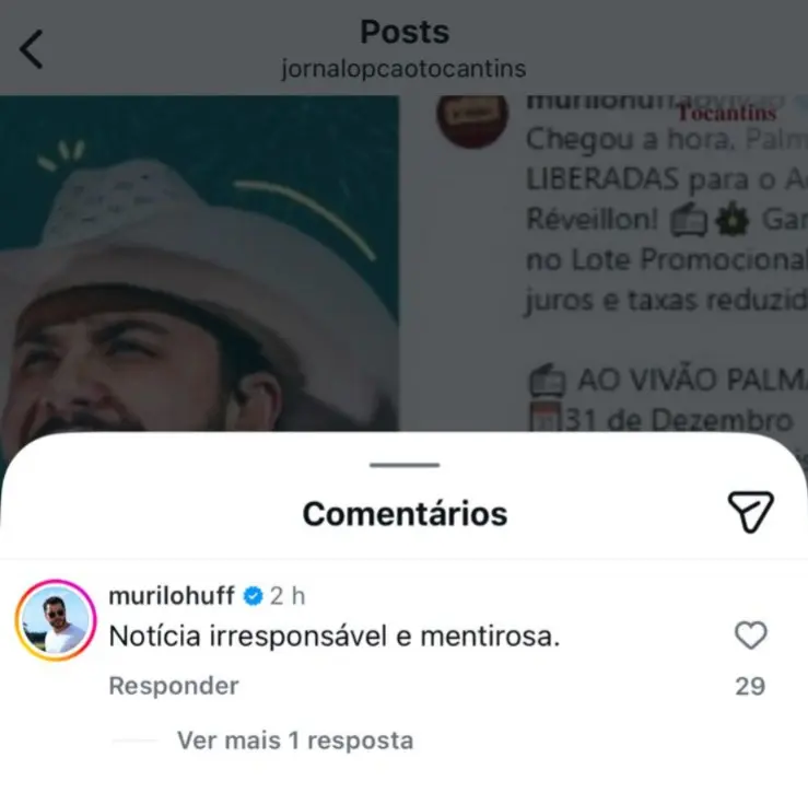O cantor Murilo Huff reagiu publicamente à controvérsia envolvendo a autorização de seu show previsto para 31 de dezembro, na Praça dos Girassóis, em Palmas. Após a divulgação de uma nota oficial do Governo do Tocantins informando que não havia nenhum pedido formal protocolado para o evento, o artista classificou a informação como “mentirosa e irresponsável”.