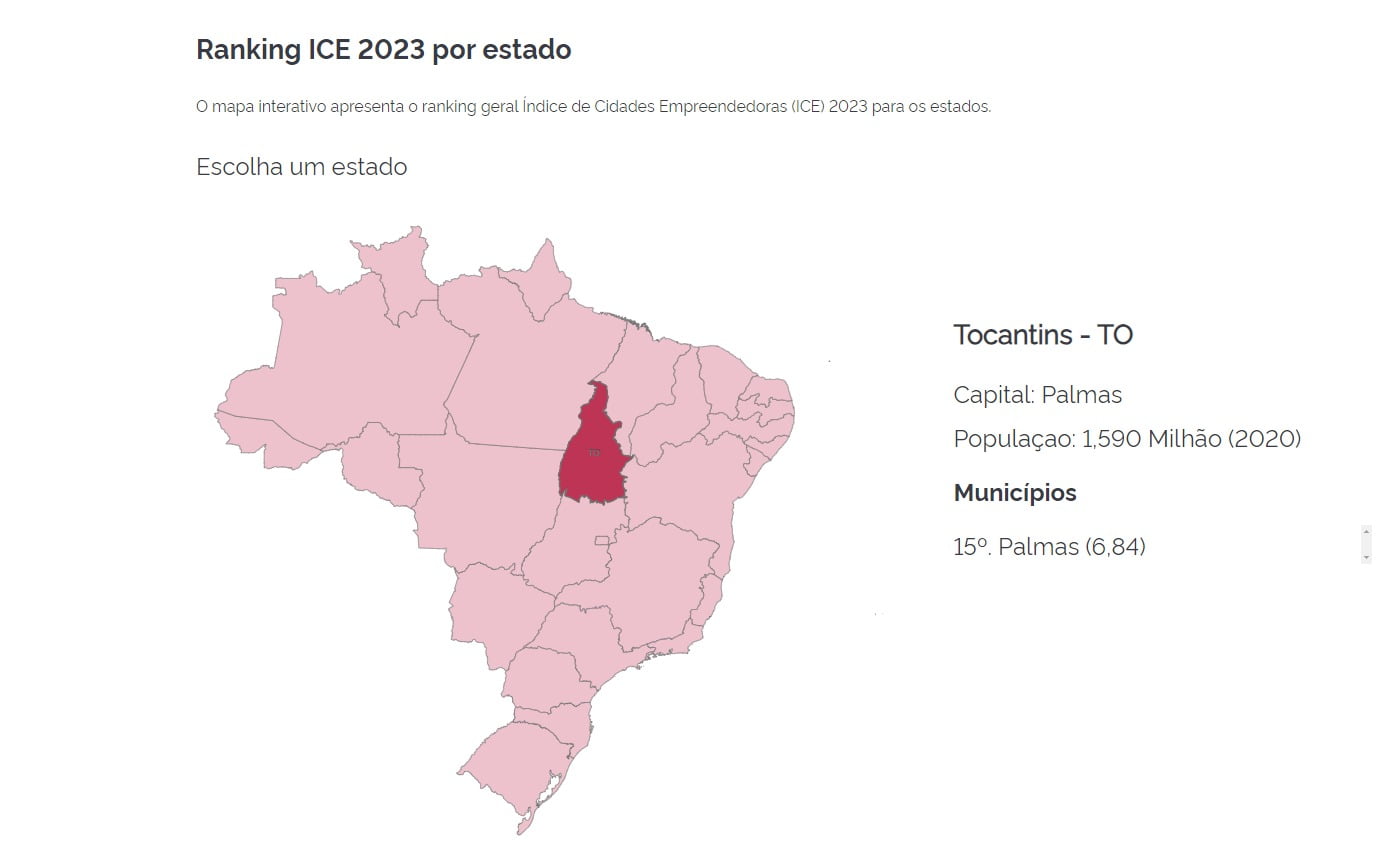 Palmas é a 16ª melhor cidade do país para empreender em 2023, com 6,845 pontos, conforme aponta o Índice de Cidades Empreendedoras (ICE) feito pela Escola Nacional de Administração Pública (Enap). A capital do Tocantins subiu 25 posições em relação ao ano anterior, quando ocupava a 41ª posição do ranking. As melhores cidades do país no ICE foram São Paulo, Florianópolis e Joinville, ocupando o 1º, 2º e 3º lugares, respectivamente.