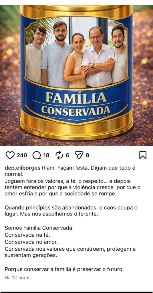 O deputado federal Eli Borges (PL) divulgou arte com a própria família dentro de uma lata estilizada. No texto que acompanha a publicação, afirma que princípios não podem ser abandonados e relaciona valores familiares à preservação do futuro.