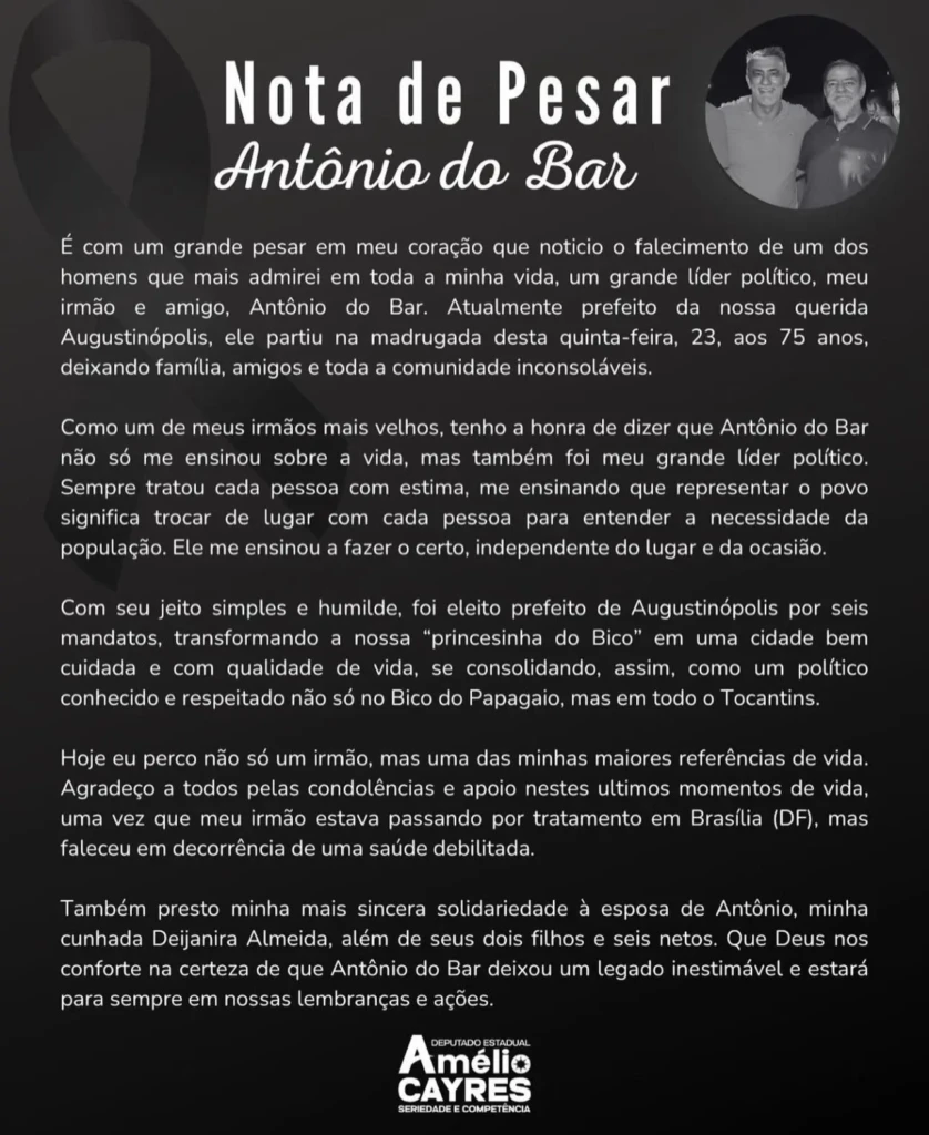 Augustinópolis, com cerca de 17 mil habitantes, é considerada a terceira maior cidade do Bico do Papagaio e um polo educacional da região. Antônio do Bar era irmão do deputado estadual e presidente da Assembleia Legislativa do Tocantins, Amélio Cayres (Republicanos).