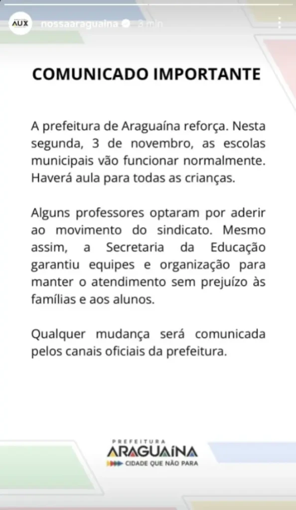 A Prefeitura de Araguaína divulgou neste domingo, 2, um comunicado informando que as aulas nas escolas municipais funcionariam normalmente nesta segunda-feira, 3. De acordo com a nota, a Secretaria da Educação teria organizado equipes para garantir o atendimento “sem prejuízo às famílias e aos alunos”, mesmo com parte dos professores aderindo ao movimento sindical.