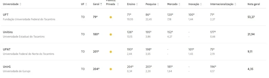 Veja abaixo os desempenhos detalhados das universidades tocantinenses: