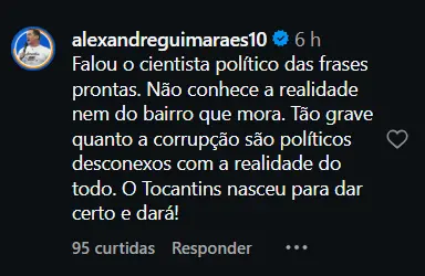Críticas também destacaram que a fala ignora avanços institucionais, econômicos e sociais do Tocantins desde sua criação, além de desconsiderar que problemas relacionados à corrupção não são exclusivos de uma única unidade da federação.